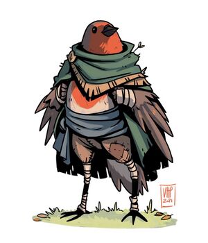 Quince is an aarakocra resembling a robin. He is short and stout in stature, with dark blue-grey feathers along his head, back, and wings, and a red, speckled underbelly. He puffs up his feathers when flustered, becoming almost spherical. Quince is usually scruffy in appearance, and often festooned with evidence of his alchemical work, clothes and feathers stained, singed, or actively smoking.
