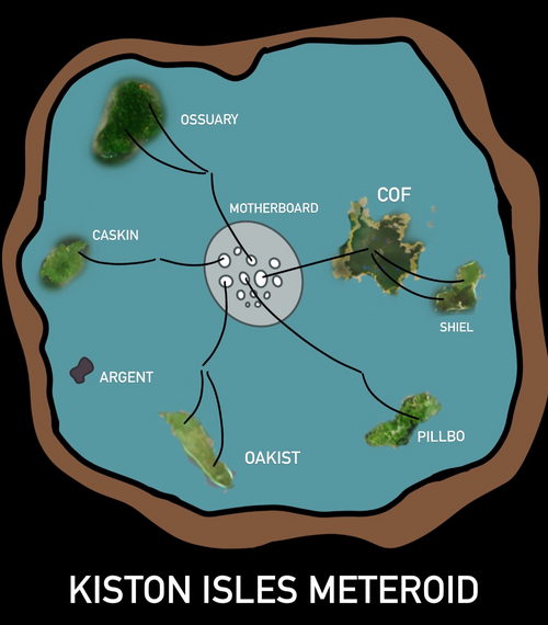 Shaped like a giant pool on top of an upside down pyramid, K.I.M. (the Kiston Isle Meteoroid) contains 6 islands in it's pool with a manmade mechanical island Motherboard built at the center, a hub for the network for that connects each of the islands through thick wires that anyone can connect to in order to send messages, retrieve data, and send information into the system. Despite each of the islands having their own leadership and development, they are all connected and in agreement and partake in the protection and upkeep of Motherboard, at least until the attack of the Sonrise Coalition, which crippled her during the events of the Sonrise.