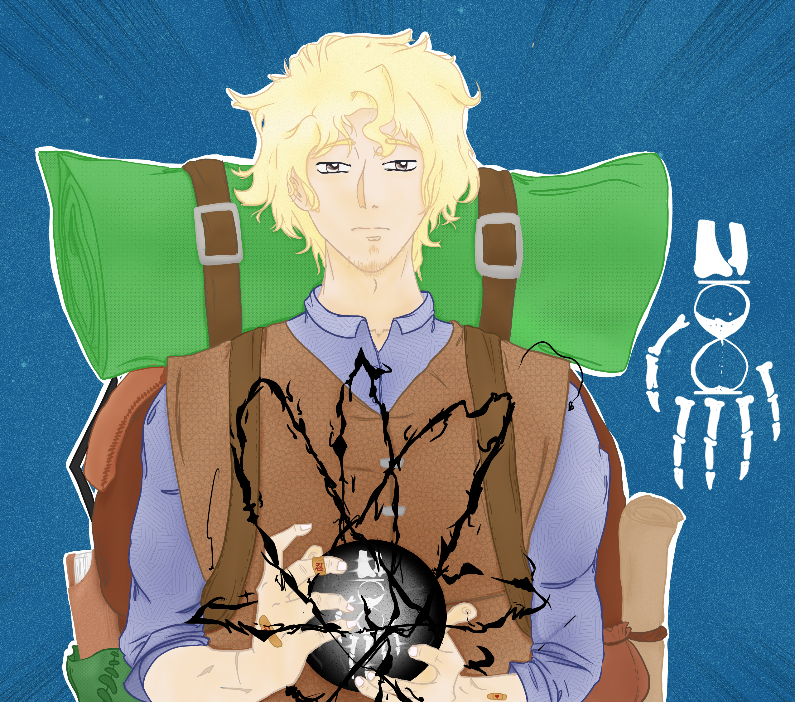 A Blonde man with long, somewhat greasy hair. He has some stubble on his chin, and a few scars on his hands from long days working.