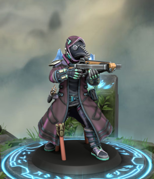 Hugo Stands at above average height with an average build. He wears a large purple coat adorned with many small pockets and satchels, including a quiver full of crossbow bolts. Underneath his heavy cloak are basic dark adventurers leathers. He wears thick and heavy gloves along with two strong blue paladins on his shoulders. He wears his purled hood up along with a dark crows mask, which has become worn do to years of age and being witness to many battles. It is covered in stiches and replacement fabrics which Hugo has had to use to repair it after being damaged from claws, arrows, and the like. With him always is his trusty crossbow which seemingly has lines of orange pulsing energy moving along its ridges. In battle he is rarely seen as he holds to the edges to line up the perfect shot so his crossbow can make its mark and fell his foes. But most of the time he wont even be in the fray as he prefers to take out his foes long distance, where they don't even know they are about to get a crossbow bolt to the neck.