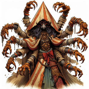 - A figure in a heavy cloak with too many arms and hands to count, also seen as a tall thin figure with hundreds of thin arms and hands and a large toothy smile.