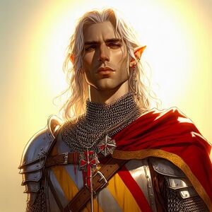 Coryn is a graceful figure, normally cloaked in red and yellow cloths inlaid in the regal heraldry of the Morning Lord. His pale hair flows slightly past his shoulders, framing ears adorned with jewelry displaying the sunrise of the Dawnbringer. His eyes are a warm hazel, and he is shrouded in a subtle glow, as if shrouded by the light spilling over the horizon just before morning comes.